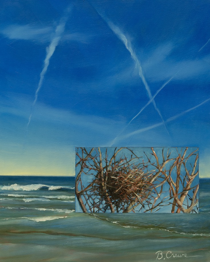 No matter how beautiful the sky, humanity leaves its mark. The crossed marks in the sky are are echoed in the nest and connects us all.